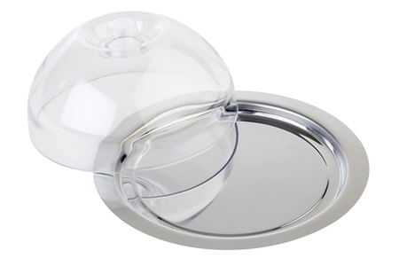 - W skład zestawu wchodzą: taca z rantem gładkim wykonana ze stali nierdzewnej o średnicy 220 mm oraz przeźroczysta pokrywa z tworzywa